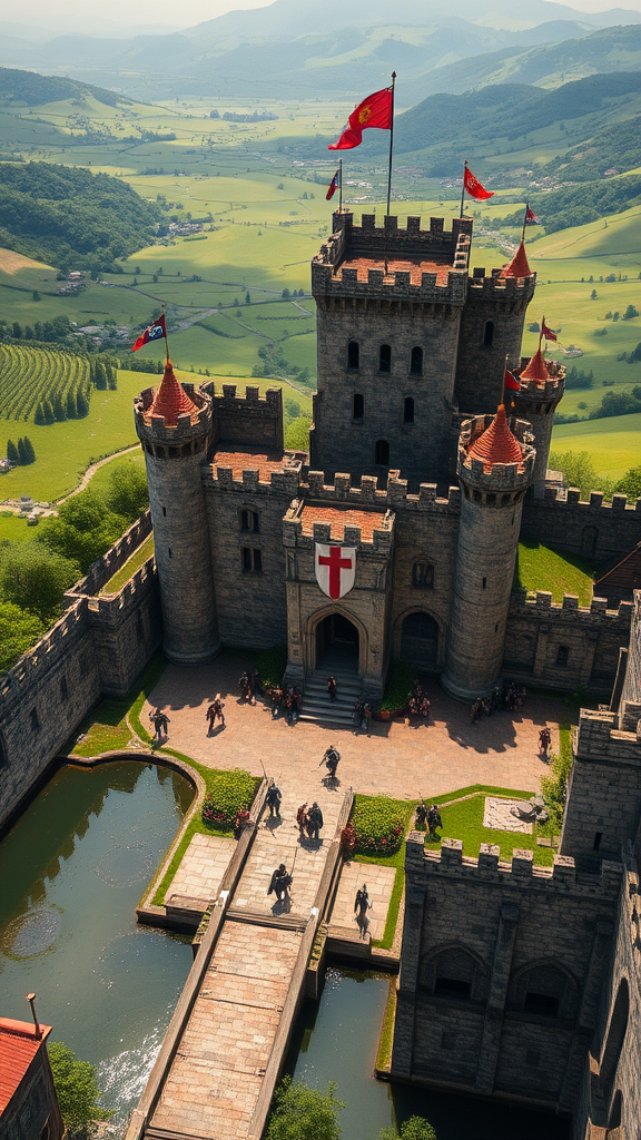 In the midst of a sprawling green valley, a majestic medieval castle stands proudly, its towering stone walls casting long shadows over the land. A deep moat encircles the fortress, its waters glistening under the sun as the drawbridge lies lowered, welcoming both friends and allies. The clank of armored knights echoes through the courtyard, where they gather, their lances and shields gleaming, ready for the call of battle. High upon the battlements, vigilant archers stand poised, their eyes scanning the horizon for any sign of approaching foes. In the background, the distant rumble of war threatens, a reminder of the fierce conflicts that threaten the peace of this historic stronghold, where banners flutter defiantly in the breeze and the code of chivalry reigns supreme.