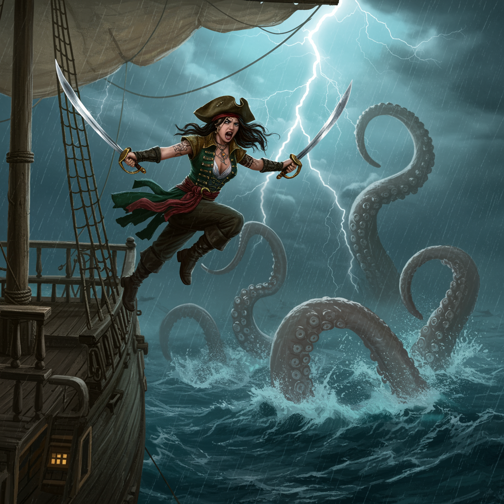In the midst of a stormy Caribbean sea, a stunning yet formidable female pirate captain with intricate tattoos stands determined atop the swaying mast of an imposing Spanish galleon. Clad in attire reminiscent of a legendary corsair, her piercing dark eyes lock onto the monstrous Kraken below. With a fierce yell, she launches herself into the air, both hands gripping the hilt of her gleaming saber. As she slices through the rain-soaked atmosphere, the Kraken—a chaotic mass of thrashing tentacles—surges upwards, exuding menace towards her besieged ship. Unfazed, she plummets with unwavering precision, aiming her blade at the beast’s formidable head. Illuminated by intermittent flashes of lightning, she becomes a striking figure—a fusion of tempest and steel—on a fearless descent to conquer the ancient leviathan.