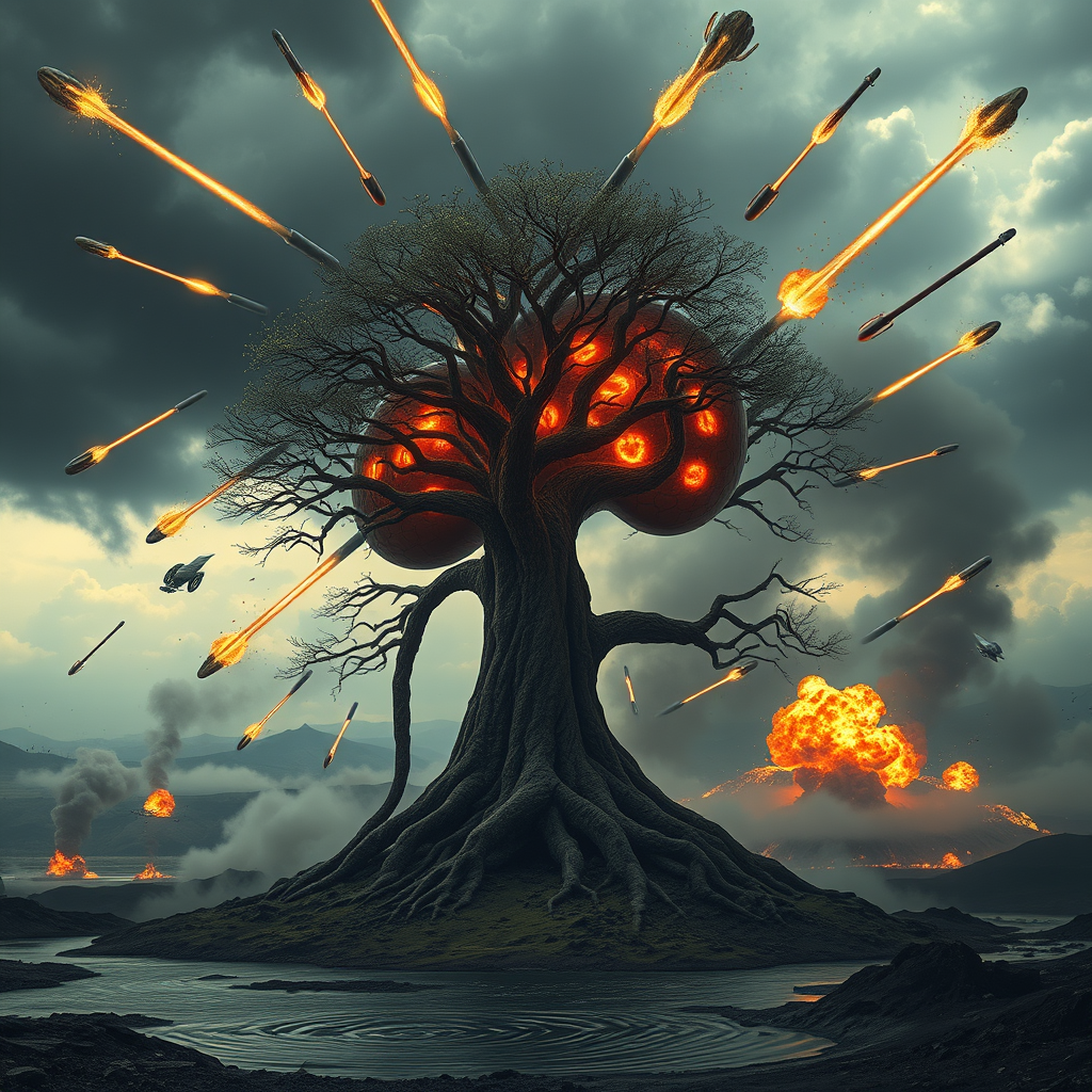 In the midst of a surreal apocalyptic war scene, a colossal tree shaped like a human kidney stands at the center, its branches resembling intricate alveoli patterns, pulsating with a faint, fiery glow through subtle cracks. This tree, a symbol of life and vulnerability, stands resolutely as it endures an aggressive onslaught. Fiery meteors streak across the darkened, smoke-filled sky, trailing glowing embers and ash. Some of these fireballs soar mid-flight, while others crash to the ground, unleashing massive explosions that hurl debris into the air, smoke and flames consuming the surrounding terrain. Below, a once serene lake ripples violently, portions evaporating into mist from the intense heat of the conflagration. The landscape is a battlefield; scorched, blackened hills lie in the background, with smoke spiraling ominously upward, and craters marking the land around the tree. Above, the sky is a tumultuous blend of dark gray clouds with streaks of vibrant fiery reds and subtle orange hues from a beleaguered setting sun, struggling to break through the devastation. The glaring flashes of fireballs and eruptions cast sharp shadows and infuse the war-torn scene with an intense, cinematic glow. This setting evokes a sense of desperation and a climactic struggle, like a pivotal war moment from an epic film, with chaos, destruction, and the delicate symbol of life at the heart of turbulence. The entire scene is portrayed in a hyper-realistic, cinematic style, capturing dynamic motion, vivid colors, and the intricate details of blazing flames, swirling smoke, and the fractured environment.