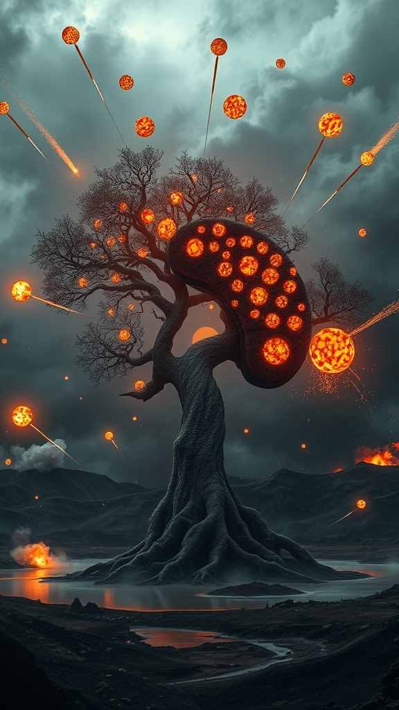 In the midst of a surreal, apocalyptic war scene lies a massive tree shaped like a human kidney, its branches intricately forming patterns reminiscent of alveoli, glowing faintly with fiery cracks. This tree, a symbol of life and vulnerability, stands resolute amid chaos. Its sinewy roots dig deep into the earth as fiery fireballs pierce the dark, smoke-filled sky, leaving behind trails of glowing embers and ash. Some fireballs hang momentarily in mid-flight, while others have struck the ground, creating colossal explosions that hurl debris skyward, with flames consuming everything in their path. Below, a once-peaceful lake now convulses violently, its waters evaporating into mist under the fierce heat of the blasts. The landscape bears the scars of war, with hills blackened and scorched in the background, and smoke rising ominously into the gloom. Impact craters pockmark the terrain around the tree. Above, the sky is a chaotic tumult of dark gray clouds interwoven with fiery reds and faint oranges from the remnants of a setting sun, struggling to pierce through the devastation. Bright flashes from the fireballs and explosions cast stark shadows and bathe the battlefield in an intense, dramatic glow. This scene captures the essence of a desperate battle, echoing the climactic moments of an epic saga, where chaos and destruction reign but resilience endures, with the fragile symbol of life at its heart. The scene is depicted in a hyper-realistic, cinematic style, capturing dynamic movement, vivid colors, and intricate details of fire, smoke, and the shattered environment.
