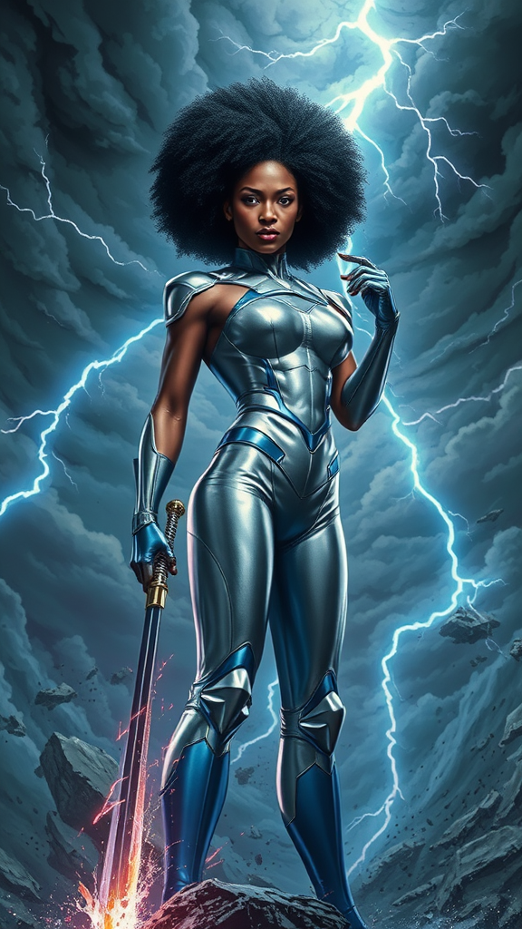 In the midst of a swirling tempest, a formidable female superhero stands poised, her silhouette stark against the churning clouds lit intermittently by jagged streaks of lightning. Clad in an advanced suit of shimmering silver and cobalt, the attire clings to her form like a second skin, reflecting the chaos around her. In her right hand, she grips a gleaming sword that buzzes with energy, tip angled toward the earth as though channeling the storm itself. Her left hand is thrust skyward, fingers splayed wide, seemingly commanding the storm to heed her will. Her afro, a crown of coiled defiance, frames a visage of unyielding determination and fiery intensity. The darkened heavens behind her, alive with electricity and roaring fury, serve to amplify the surreal and electrifying aura of her presence. The scene unfolds like a battle hymn in a graphic novel, the atmosphere thick with tension and the promise of imminent action.