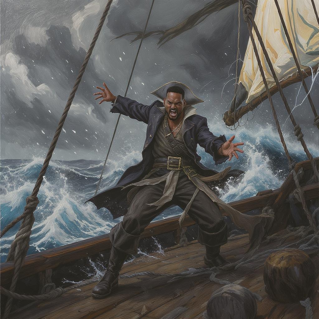 In the midst of a turbulent ocean, atop the deck of a weathered pirate ship, a fierce and animated Will Smith dominates the scene. His vivid gestures slice through the salty air, exuding palpable frustration, as waves crash against the ship's hull. The palette is a stormy blend of porpoise gray skies, flint-hued masts, fossil-white sails, and charcoal shadows interplaying within the chaos. This dynamic tableau is brought to life in a style that melds the vivid intensity of Fauvism with the emotive brushstrokes of Expressionism, capturing the raw emotional energy of the moment.