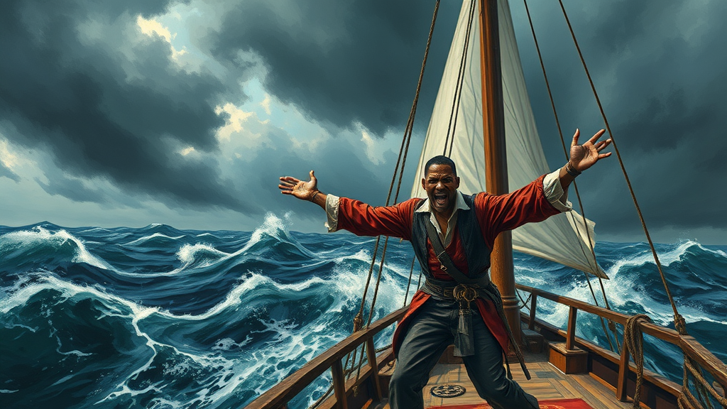 In the midst of a turbulent sea, a furious Will Smith stands on the deck of a pirate ship, his arms animated in wild, expressive motion. Around him, the ocean roils in shades of porpoise and flint, while dark clouds loom overhead in hues of fossil and charcoal. The ship's sails billow, stark and white against the stormy backdrop. The scene is painted in bold, Fauvist strokes, capturing the raw emotion and energy of the moment, with an Expressionist flair that amplifies the dramatic tension of the high seas adventure.