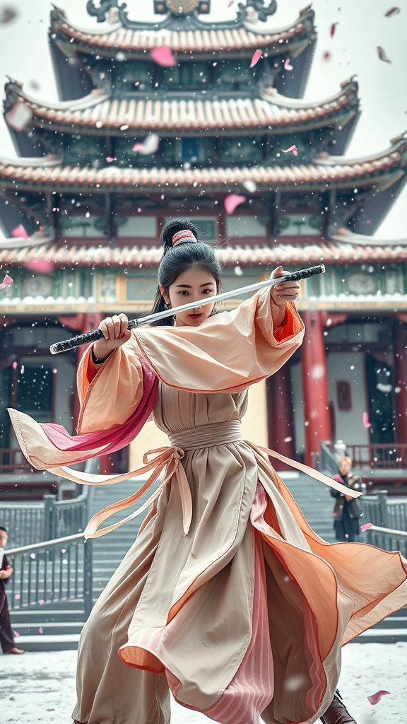 In the midst of swirling snow and fluttering petals, a captivating 16-year-old Chinese girl in a gracefully flowing Hanfu wields her sword with precision, her movements a blend of defense and art in the heart of a majestic temple. A panorama captures the cinematic splendor, with movie-quality lighting and shadows adding depth to the scene. She embodies the essence of martial arts, a dance of skill and strength against a backdrop reminiscent of a Chinese fairy tale, where colorful points of light twinkle around her. The scene is highly detailed, dynamic, and dramatic, evoking a sense of mythology in stunning 35mm clarity, where realism and fantasy intertwine in an epic display.