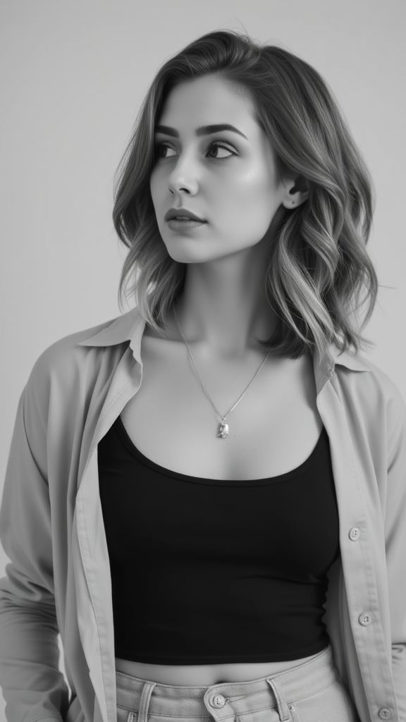 In the monochromatic image, a young woman with shoulder-length wavy hair is captured. She wears a trendy ensemble featuring an unbuttoned light blouse draped over a fitted dark tank top, paired with a fine necklace adorned with a tiny charm. Her makeup is understated, highlighting her natural beauty, and her eyes carry a thoughtful expression as she looks just past the camera. The black and white tones accentuate her understated grace and the quiet sophistication of her style.