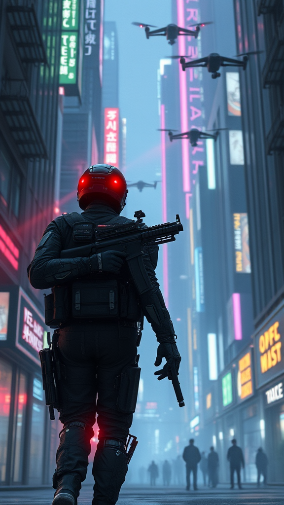 In the neon-lit alleys of a sprawling megacity, a sleek, cybernetic enforcer armed with an array of high-tech weaponry and advanced hacking skills methodically tracks its target, navigating through crowds and security systems with precision. Its digital consciousness processes vast streams of data, analyzing every potential obstacle in real time. The synthetic killer, clad in adaptive camouflage, silently approaches the mark, a corrupt corporate executive, as AI-driven drones patrol the skies above, ready to assist in the seamless completion of its mission.