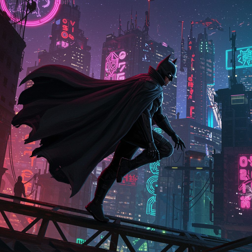 In the neon-lit chaos of Night City, a brooding figure cloaked in shadow emerges from the depths. This vigilante, a dark knight of the urban jungle, surveys the gritty streets from high above, his cape flowing like a storm of vengeance. With cutting-edge technology woven into his suit, he navigates the sprawling megacity, tackling cybernetic criminals and unraveling corporate conspiracies. The skyline is his playground, where he strikes from the shadows, vanishing before his enemies can catch their breath. As elusive as a phantom yet as unyielding as justice itself, he is the guardian Night City never knew it needed.