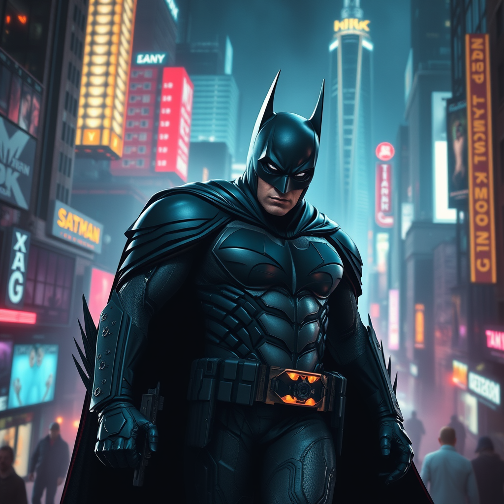 In the neon-lit chaos of Night City, a shadowy figure known as the Batmaneuvered through the towering skyscrapers and gritty alleyways, his sophisticated gadgets and dark, high-tech armor setting him apart as he hunted down cyber-enhanced criminals and corrupt conglomerates, seeking justice in a place where lawlessness thrived amid the glow of holograms and endless intrigue.