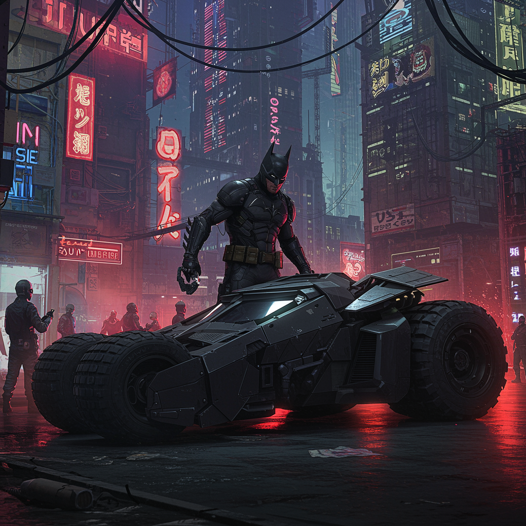 In the neon-lit chaos of Night City, a shadowy figure known as the Dark Knight emerges from the shadows, navigating the dystopian sprawl with unmatched stealth. Armed with an arsenal of advanced gadgets and a futuristic Batmobile, he confronts cyber-enhanced criminals and corrupt corporations, becoming a symbol of justice for a city teetering on the brink of anarchy. As he delves deeper into the web of deceit and danger, he uncovers secrets that could alter the city's destiny forever, all while maintaining the cloak of mystery that shrouds his true identity.