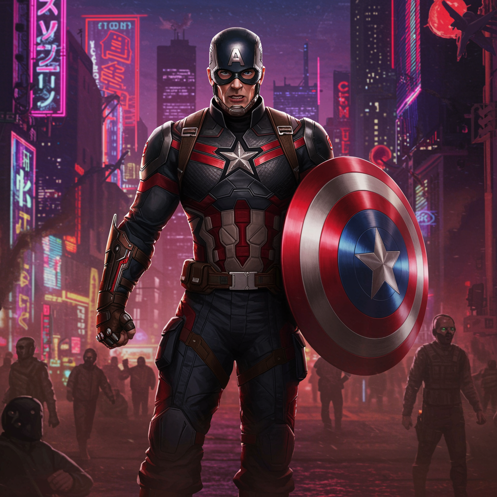 In the neon-lit streets of Night City, where skyscrapers pierce the smog-filled sky, an alternate reality unfolds as a twisted version of Captain America emerges. Clad in high-tech armor with red and black hues, this sinister figure patrols the dystopian chaos, overseeing a rebellious underground with a cold, authoritarian demeanor. Augmented with cybernetic enhancements, his shield hums with kinetic energy, deflecting bullets and delivering swift justice to those who oppose his vision. With the city under his iron grip, resistance factions plan in the shadows, seeking to overthrow his regime and restore freedom to the oppressed citizens. His corrupted sense of justice twists patriotic ideals into a reign of control, making him a symbol of fear in a world already teetering on the brink of lawlessness.
