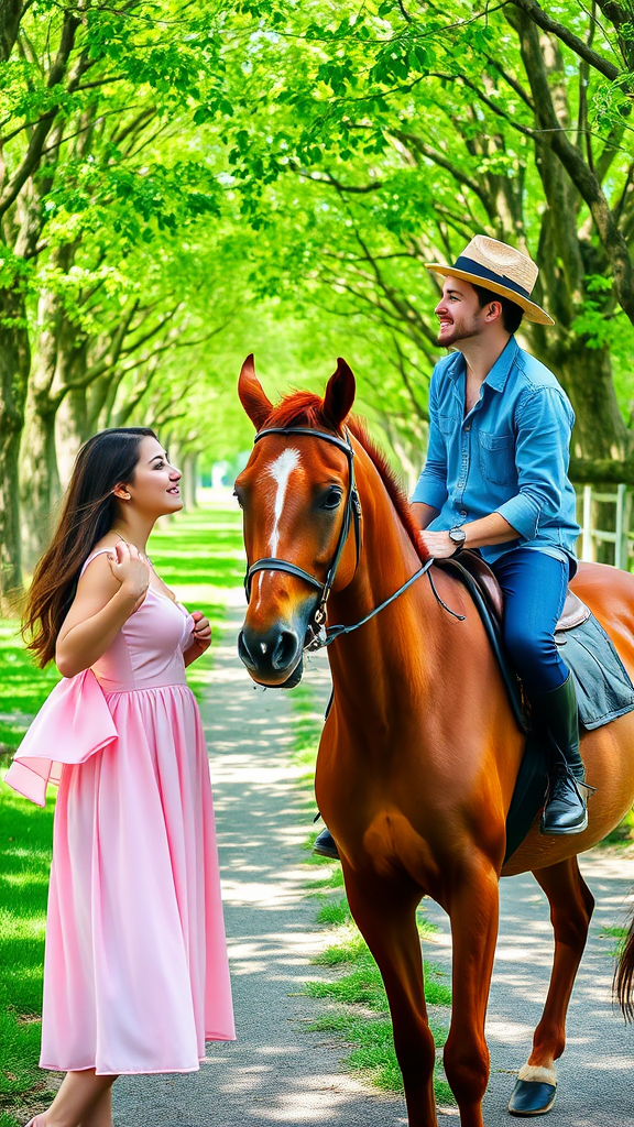 In the peaceful setting of a tree-lined path, a young woman in a pastel pink dress and a man atop a chestnut horse share a tender moment. The woman, with her flowing brown hair, stands to the left, her eyes gently meeting those of the horse. Her pink dress creates a stunning contrast with the surrounding greenery. The man on the horse, on the right, looks back at the woman with a relaxed, joyful expression. He wears a denim shirt and a straw hat, adding a cheerful splash of color against the rich hues of the horse. The horse, with its sleek, chestnut coat, stands serenely on the path. Behind them stretches a lush green meadow, serving as a tranquil stage for this scene. The natural light filters softly through the tree branches, creating a play of shadows on the ground. The entire atmosphere is calm and romantic, capturing a genuine connection between two individuals in this enchanting outdoor setting.
