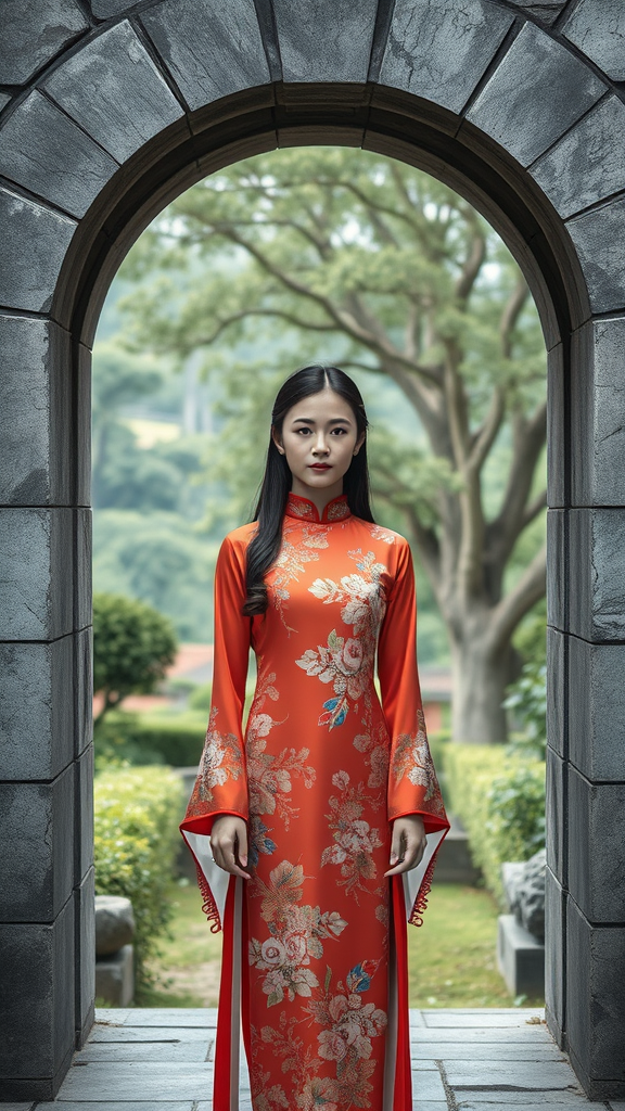 In the peaceful setting of an ancient stone archway, a young woman becomes the centerpiece of this scene. She wears a traditional Chinese dress, adorned with intricate floral patterns and elegant long sleeves. The dress's vibrant hues stand out against the muted tones of her surroundings, offering a striking contrast. Her expression is thoughtful, adding a layer of intrigue to her presence. The archway frames her perfectly, directing attention right to her. The stone structure of the archway exudes rustic elegance, its gray shades harmonizing with the natural greenery that unfolds around it. Beyond her, a lush garden stretches, alive with verdant foliage and towering trees, creating a serene and soothing backdrop. The soft, diffused lighting casts gentle shadows, enhancing the textures of both the stone and her dress. This contributes to a warm, welcoming atmosphere, further enriched by the gentle color grading that immerses the scene in a calming pastel palette.