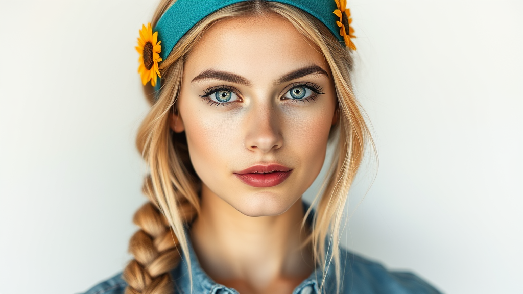 In the portrait, a young woman with a tranquil expression and refined features stands out. Her honey-blonde hair cascades in a loose braid over one shoulder, accentuated by a turquoise headband adorned with sunflower motifs. Her complexion is clear and radiant, with striking pale jade eyes that convey a gentle self-assurance. She is dressed in a casually sophisticated ensemble, featuring a relaxed chambray garment. The lighting is gentle and natural, enhancing the portrait's warm and inviting essence.