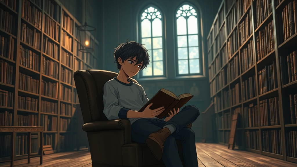 In the quiet ambiance of an old library, an introverted anime-style boy with tousled hair sits in a worn leather chair, encompassed by towering bookshelves that stretch to the dimly lit ceiling. As the evening light filters through tall, arched windows, casting shadows that dance across the room, he delves into the pages of a dusty tome. His INFJ personality shines through, lost in profound thought, embodying the essence of dark academia. The soft rustling of pages and the subtle creak of wooden floorboards form a serene symphony, enveloping him in a world of scholarly solitude and introspection.