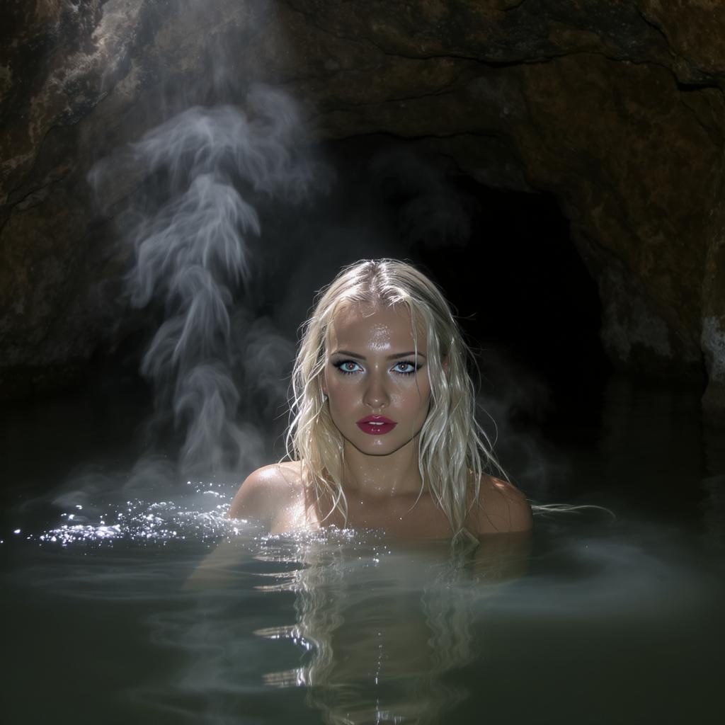 In the quiet seclusion of a dim cave, a secluded hot spring emits gentle steam that dances upwards, mingling with the shadows. A woman with cascading blonde hair, damp and shimmering, glides gracefully through the warm waters. Her eyes, mysterious and captivating, lock onto the viewer with a piercing gaze. Soft beams of sunlight pierce through the cave's entrance, casting playful reflections that shimmer across her silhouette, merging the ethereal glow of light with the tranquil aura of the underground haven.