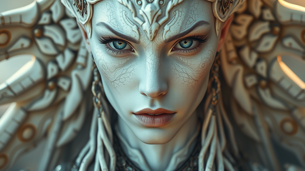 In the realm of myth and fantasy, an ancient ethereal queen of otherworldly allure stands with striking presence. Her smooth white ash skin and athletic form exude a commanding aura, with her eyes conveying a profound emotional depth. This close-up portrait captures the queen in an enchanting blend of digital art, merging imaginative fantasy and science fiction with mythological influences. The scene is adorned with exceptionally bright and intricate compositions, each detail meticulously crafted, drawing the viewer into a surreal world of adventure and wonder. The art, reminiscent of Julie Bell's masterpieces, showcases breathtaking graphics and elaborate subject matter, offering an awe-inspiring glimpse into a fantastical universe.