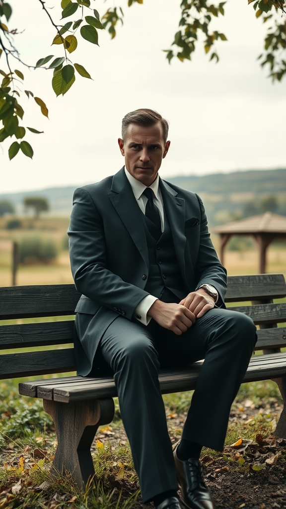 In the serene backdrop of a picturesque countryside, a dapper gentleman reminiscent of a classic Batman figure finds himself the focus of Sofia Coppola’s artistic lens. Sitting thoughtfully on an aged wooden bench, he gazes directly into the camera, his presence exuding a mysterious allure. The scene is bathed in cinematic light, with each detail meticulously rendered to highlight the textures of his tailored suit and the gentle rustling of leaves around him. The tranquil setting contrasts with the enigmatic intensity of his stare, creating a captivating narrative of elegance and intrigue.