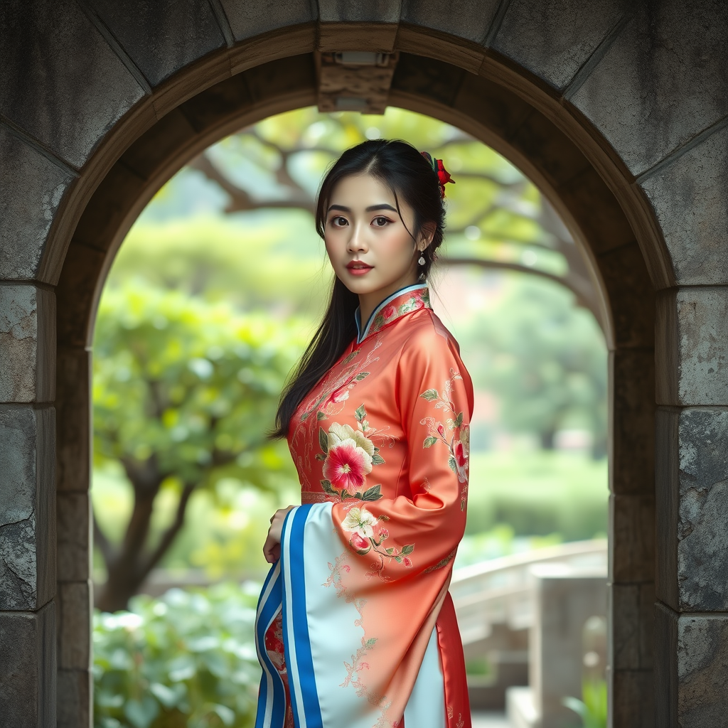 In the serene embrace of a stone archway, a young woman becomes the centerpiece of this scene, wearing a traditional Chinese dress that features intricate floral designs and gracefully flowing sleeves. The dress's vivid hues stand out strikingly against her muted surroundings. Her contemplative expression lends an enigmatic air to her character. The archway frames her figure beautifully, naturally guiding the viewer's focus to her presence. The stone structure, tinged with rustic elegance, harmonizes with the natural greenery that unfurls behind her. A lush garden spills out in the background, filled with abundant foliage and majestic trees. The vibrant greens of the garden enhance the scene's peacefulness, deepening the overall sense of tranquility. Soft, diffused lighting bathes the image, creating gentle shadows and illuminating the textures of the stone archway and her dress. This produces a warm, inviting atmosphere, heightened by a delicate color grading that washes the scene in a soothing pastel tone.