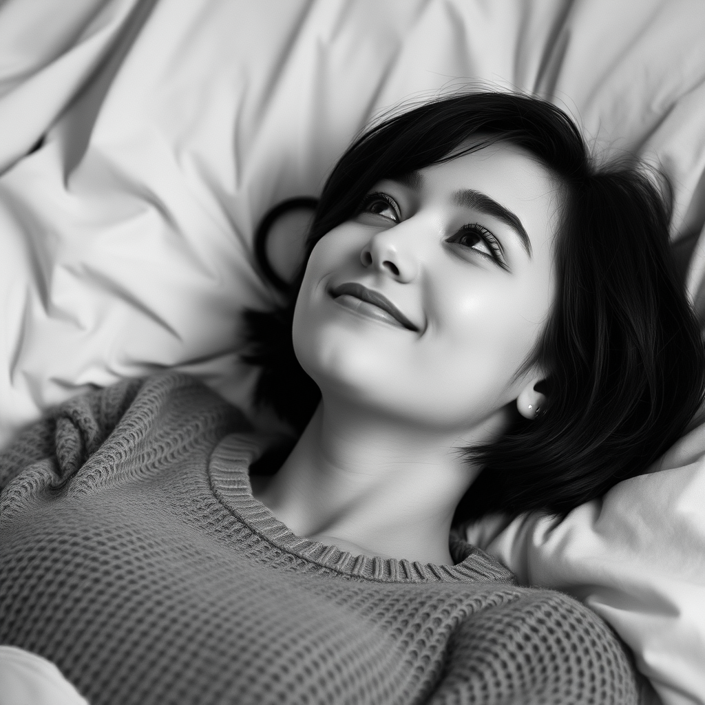 In the serene monochrome photograph, a young woman reclines on her back atop a cozy bed. Her short, dark hair frames her face, and she's dressed in a comfortable knit sweater. Her serene expression radiates tranquility as she gazes upward, a gentle smile gracing her lips. The lighting is soft and ambient, enveloping the scene in a peaceful glow with no harsh shadows or stark contrasts. The muted grayscale tones lend a timeless quality, subtly highlighting her as the focal point of the image.