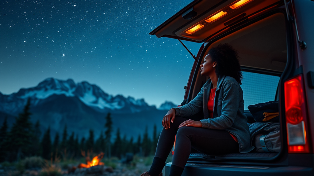 In the serene quiet of the wilderness, a 30-year-old Black woman sits comfortably at the rear of her van, her eyes tracing the rugged silhouettes of the Olympic mountains under a starlit sky. The air is infused with the subtle orchestra of forest sounds, blending tranquility with a hint of the unknown. She pokes the dying embers of her campfire, feeling the chill of a wind that stirs something deep within—a mix of awe and anticipation. Alone in this vast landscape, she contemplates her journey and takes a moment to inventory her supplies and ponder her path forward. What discoveries lie ahead? What challenges will she face? In this moment of solitude, she's enveloped by a sense of peaceful determination, ready for whatever the road might bring.