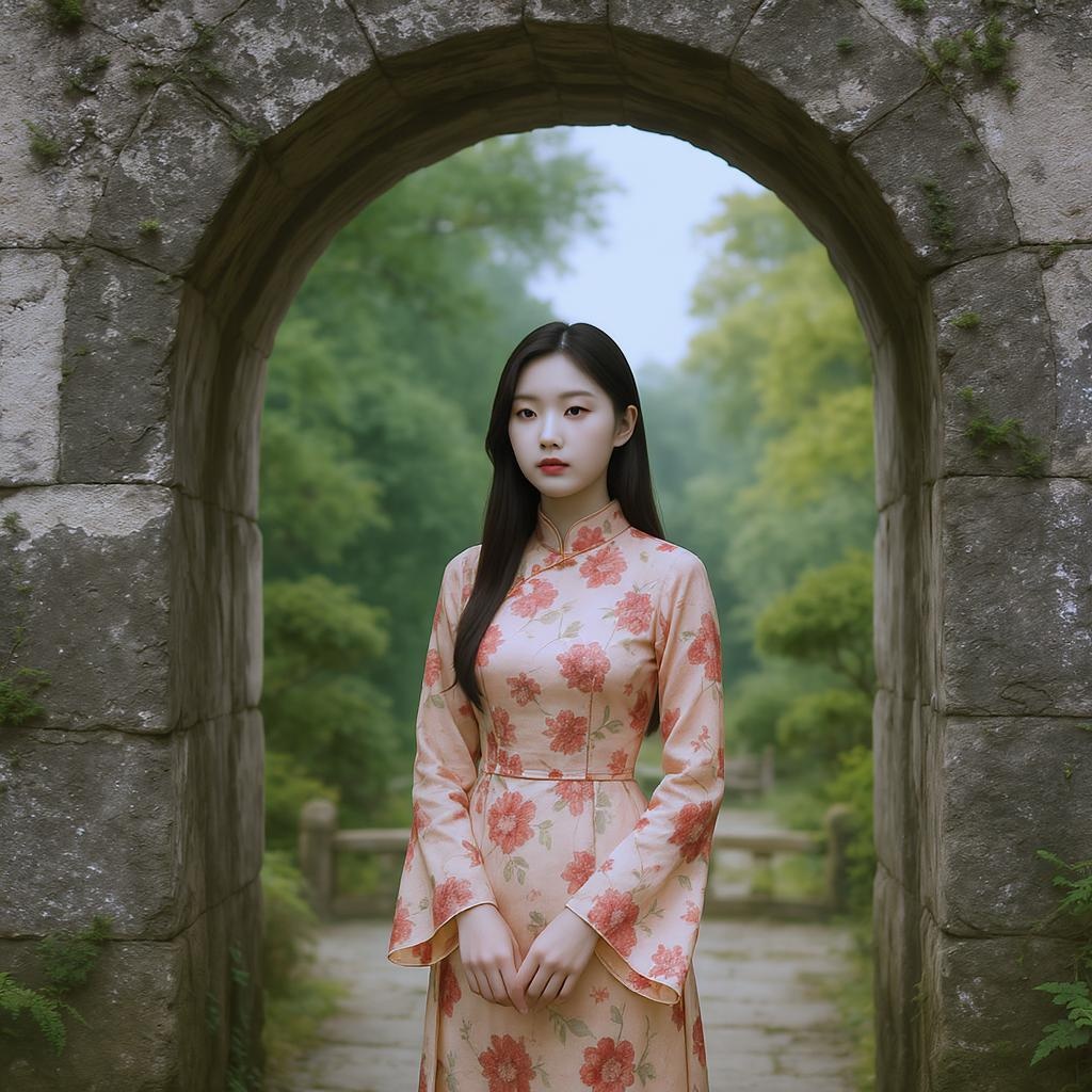 In the serene setting of a stone archway, a young woman becomes the central focus of the scene. She is adorned in a traditional Chinese dress with an intricate floral pattern and elegant long sleeves. The vibrant hues of her attire stand out against the neutral tones around her. Her expression is thoughtful, adding a sense of enigma to her presence. The archway frames her perfectly, drawing the viewer's gaze directly to her. The stone structure of the archway exudes rustic charm, its gray shades harmonizing with the lush greenery that serves as a backdrop. Beyond, a garden stretches out, filled with verdant foliage and towering trees. This garden's rich tones provide a peaceful and soothing atmosphere, enhancing the overall tranquility. The lighting is soft and diffused, casting gentle shadows that highlight the textures of both the stone arch and her dress. This creates a warm, welcoming ambiance, further enhanced by subtle color grading that infuses the scene with a calming, pastel palette.