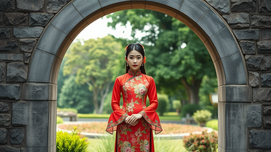 In the serene setting of a weathered stone archway, a young woman stands as the centerpiece of this scene. She wears a traditional Chinese dress with intricate floral patterns and elegant long sleeves. The dress's bright colors strikingly juxtapose the archway's subdued tones. Her expression is thoughtful, adding a hint of enigma to her character. The archway frames her perfectly, leading the viewer's gaze directly to her. The stone archway exudes a rustic charm, its gray hues harmonizing with the lush greenery that serves as the backdrop. Behind her, a vibrant garden unfolds, abundant with rich foliage and towering trees. The garden's deep greens contribute to a tranquil and peaceful setting. The lighting is soft and diffused, casting gentle shadows that accentuate the textures of the stone archway and the woman's dress. This creates a warm, welcoming ambiance, enriched by a subtle pastel color grading that enhances the scene's calm and soothing atmosphere.