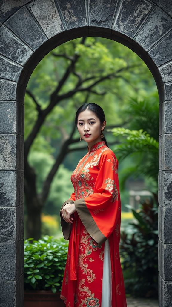In the serene setting of an ancient stone archway, a young woman stands as the centerpiece of this image. She wears a traditional Chinese dress, adorned with intricate floral patterns and flowing sleeves. The vibrant colors of her dress create an enchanting contrast against the muted tones of her environment. Her expression is thoughtful, adding a layer of intrigue to her presence. The archway frames her perfectly, naturally guiding the viewer's gaze toward her. The weathered stone of the archway exudes a rustic charm, its gray tones harmonizing with the lush greenery that serves as the backdrop. In the background, a verdant garden unfurls, rich with diverse foliage and graceful trees. The garden's deep greens infuse the scene with a sense of peace and tranquility. The lighting is soft and diffused, casting delicate shadows that emphasize the textures of the stone archway and her dress. This creates a welcoming and warm atmosphere, further enriched by the gentle color grading that washes the scene in a calming pastel hue.