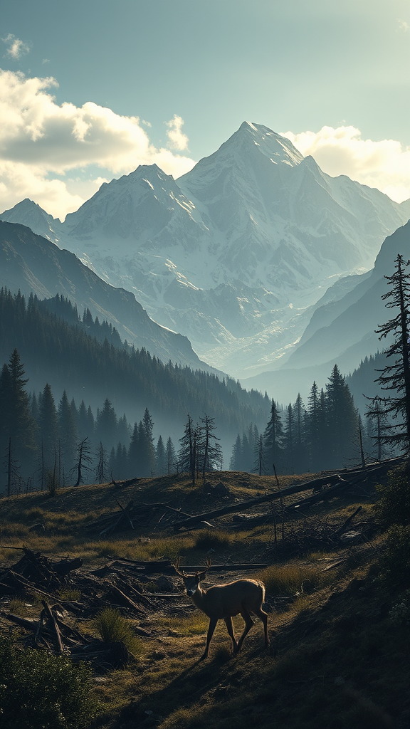 In the shadow of majestic mountains, a lone deer wanders through a post-apocalyptic landscape, its grace unmarred by the chaos surrounding it. The remnants of civilization lie in eerie silence, overtaken by nature’s reclamation. Echoes of a lost world linger as zombies shuffle through the undergrowth, relentless in their search, while the deer embodies a fragile hope amidst desolation. A story of survival unfolds against the backdrop of a world where wild beauty and ruin coexist.
