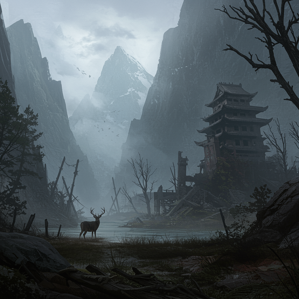 In the shadow of towering, majestic mountains, a lone deer roams cautiously through a landscape transformed by time. Echoes of civilization linger in the form of crumbling ruins, now overrun by nature's grasp. The air is thick with an eerie silence, occasionally pierced by the distant rustle of leaves—a reminder of the lurking threat: the undead, remnants of a world lost to a relentless plague. The atmosphere is both haunting and serene, where primal beauty and post-apocalyptic desolation coexist, as nature reclaims its dominion amid the scattered remnants of humanity.
