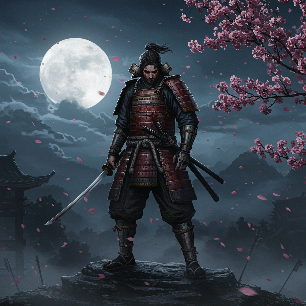 In the shadowy glow of a blood-stained moon, the last ronin stands defiantly atop a mist-covered Japanese mountain, his eyes a tempest of depression and fury. Cherry blossoms, caught in a restless breeze, dance around him like ethereal spirits whispering forgotten tales. His weathered armor, a canvas of scars and memories, bears witness to countless battles fought and lost. The night air, thick with the scent of blossoms and the weight of solitude, echoes his silent battle cry—an emotionally charged testament to a soul caught between duty and despair.