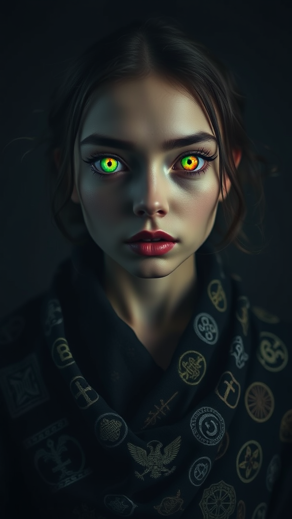 In the shadowy realm of the dark kingdom, a hyper-realistic figure emerges, her mesmerizingly large rainbow eyes capturing a deep-seated horror. Each blink reflects an intricate tapestry of emotions, captured through the unparalleled clarity of a Hasselblad H4D 200MS Digital Camera paired with a Mitakon Speedmaster 65mm f/1.4 lens. Her attire is a symphony of symbols woven into fabric, each stitch telling tales of forgotten lore and ancient secrets, draped elegantly against her slender form. The portrait's composition is elongated, creating a captivating 1:2 aspect ratio that draws the viewer into her enigmatic world.
