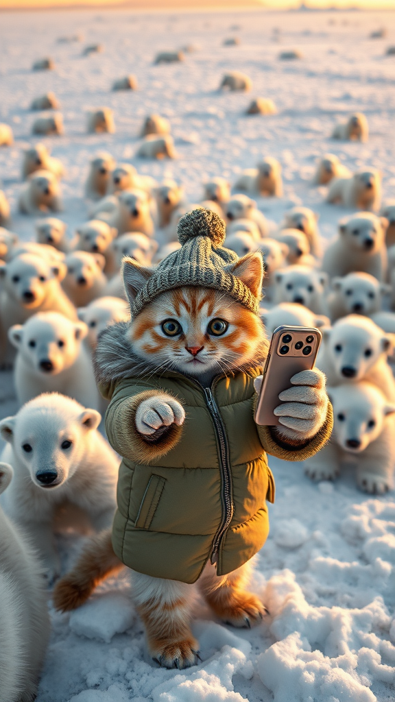 In the shimmering snow of a vast ice field, numerous polar bears dot the landscape, each one more majestic than the last. Among them, a charming kitten with oversized eyes and luscious long fur stands out, bundled up in a cozy, olive green down jacket with a matching knitted hat adorned with a tiny pom-pom. The mischievous feline holds out a smartphone, capturing a selfie amidst the playful scene. Encircling the kitten are more than a dozen curious juvenile polar bears, their fluffy white coats glowing gently in the golden hues of sunset. The scene is a harmonious blend of whimsy and wonder, set against a backdrop of endless icy wilderness illuminated by the soft, fading light of day, with intricate details captured in every aspect.