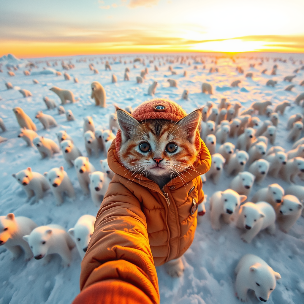 In the snowy landscape, a vast ice field stretches out, dotted with numerous polar bears majestically positioned on it. At the forefront, an adorable kitten clad in a cozy cinnamon-colored down jacket and matching hat snaps a selfie. The kitten, with its round, expressive eyes and fluffy fur, stands amidst more than a dozen miniature white polar bears. The scene is drenched in the warm glow of sunset, casting hyper-realistic and intricate details throughout the panorama, capturing a magical blend of whimsy and wonder.
