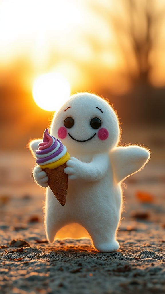 In the soft glow of a beautiful sunrise, a small, plump, cuddly felt ghost stands with an aura of warmth and joy, its tiny felt hands delicately clutching a vibrant, swirled ice cream cone. Its wide, joyful smile radiates pure innocence, engaging the viewer with an irresistible charm that melts even the toughest hearts. The gentle fibers of the felt, paired with the ghost's earnest eyes, create an atmosphere imbued with love and tenderness. As the first light of morning bathes the scene in a golden hue, hearts feel lighter, smiles grow wider, and the world seems wrapped in a comforting embrace of simple, sweet bliss.