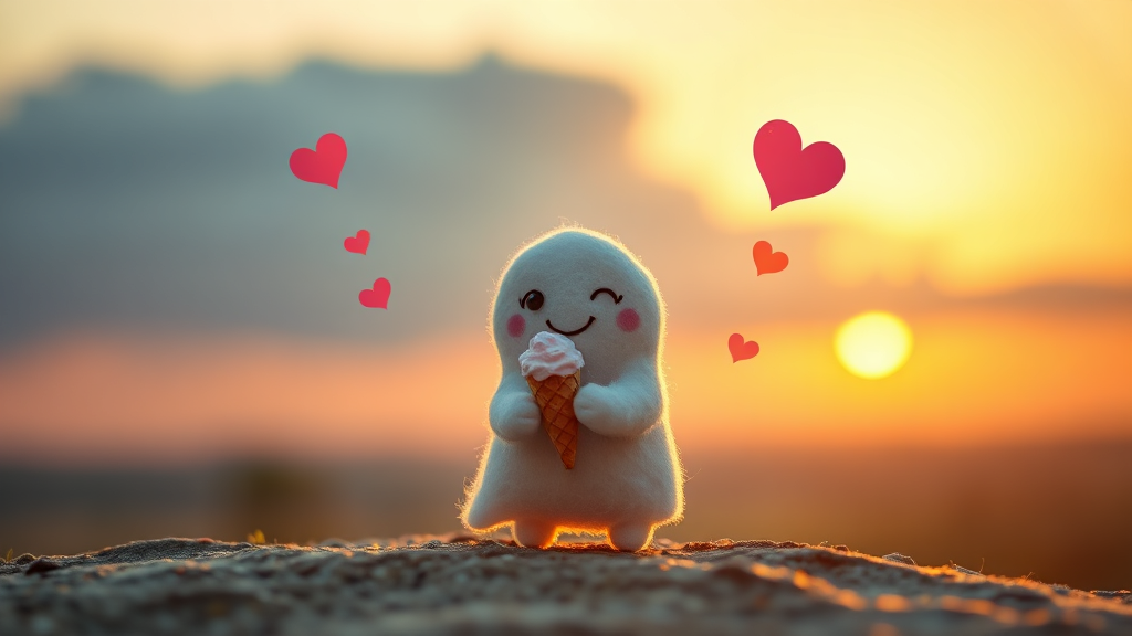 In the soft glow of a breathtaking sunrise, a small, cuddly felt ghost with a delightful pudginess stands with an ice cream cone gently cupped in its tiny hands. Its joyful smile spreads warmth and happiness, casting a spell of pure sweetness that could melt even the toughest of hearts. The felt material lends a sense of softness and comfort, while the whimsical expression on the ghost's face is full of innocent wonder. Around it, hearts seem to float in the air, buoyed by the tender atmosphere of dawn's first light. The scene feels magical and tender, like a serene dream where warmth, love, and delight come together in a beautiful embrace.