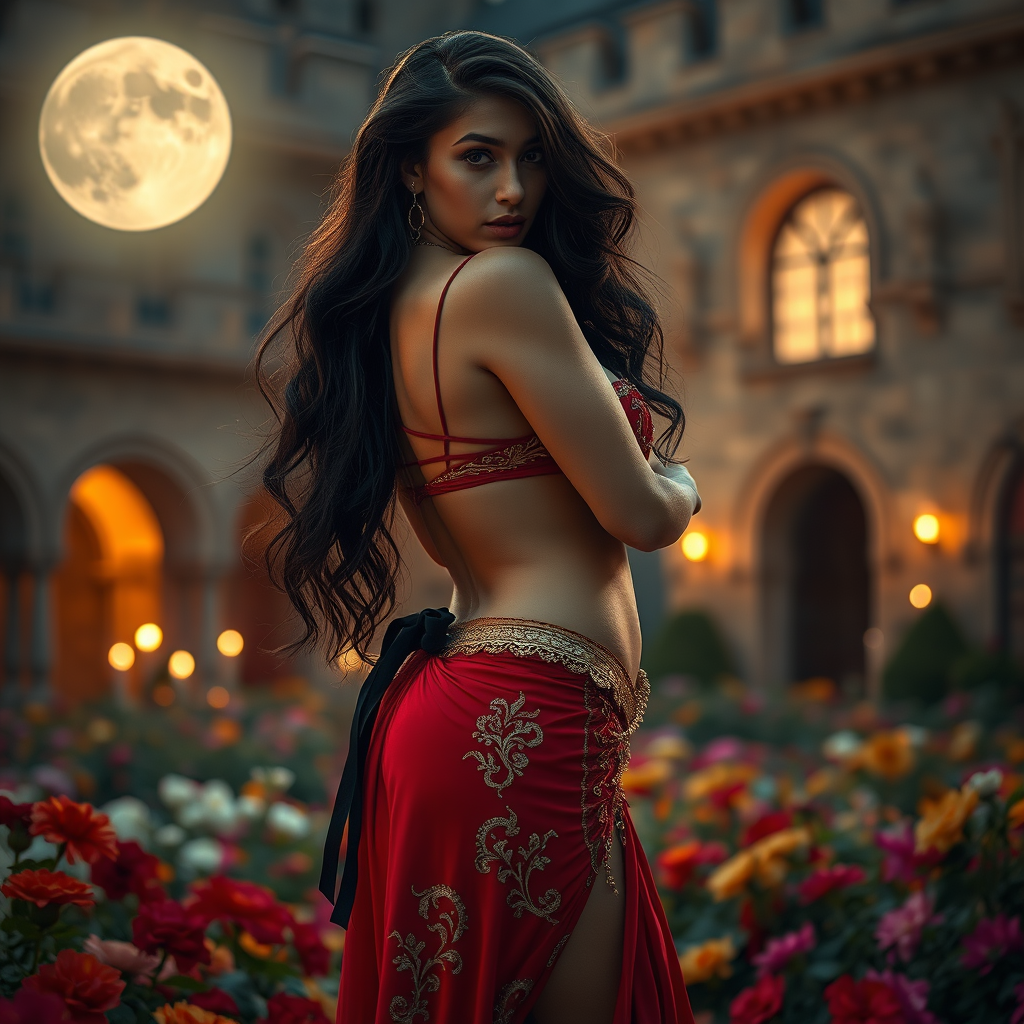 In the soft glow of a full moon, torchlight, and candlelight, a captivating beauty dances in a magnificent medieval castle courtyard, adorned in a mesmerizing red and gold belly dancer's outfit. The natural full moonlight caresses her form, revealing her sensuous stance as she stands barefoot amidst a sea of vibrant flowers. Her enchanting gaze draws the viewer in, while a sleek, black ribbon elegantly circles her neck, hinting at mystery. Her wavy, raven-black hair cascades to her hips, framing her alluring silhouette as she glances over her shoulder, inviting attention. Captured with a Leica M10 using a Helios-44 58mm f/2 lens at F2.8, this fine art photograph showcases deep, rich hues and exquisite highlights. The midday sun adds a glow to her radiant expression, with gentle, diffused light passing through her voluminous tresses, accentuating her form.