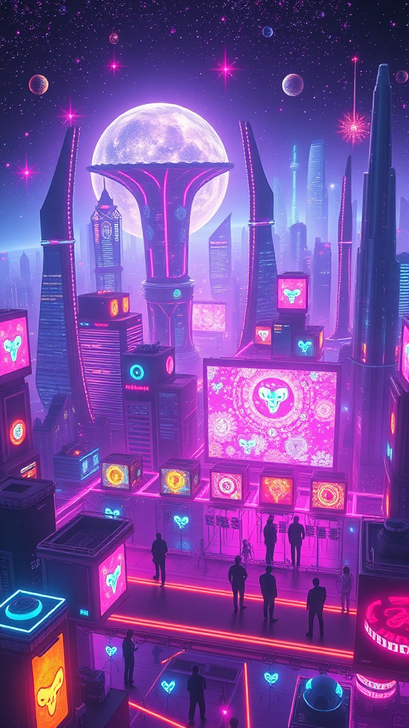 In the sprawling neon expanse of a galactic metropolis, an advanced civilization thrives where alien worlds are interconnected through a digital network. Citizens, both human and extraterrestrial, interact with cyber Tamagushis—digital companions housed in sleek, holographic devices that project mesmerizing, otherworldly creatures. These Tamagushis navigate futuristic landscapes filled with luminescent flora, bio-luminescent cities, and vibrant pulsars, communicating through bursts of color and sound. Each companion evolves in real-time, adapting to the cultural nuances of various alien species they encounter, creating unique bonds that transcend the limitations of space. This harmonious blend of cutting-edge technology and extraterrestrial wonder captures the essence of a universe where life and digital realms coexist, reshaping realities in an endless dance of innovation.