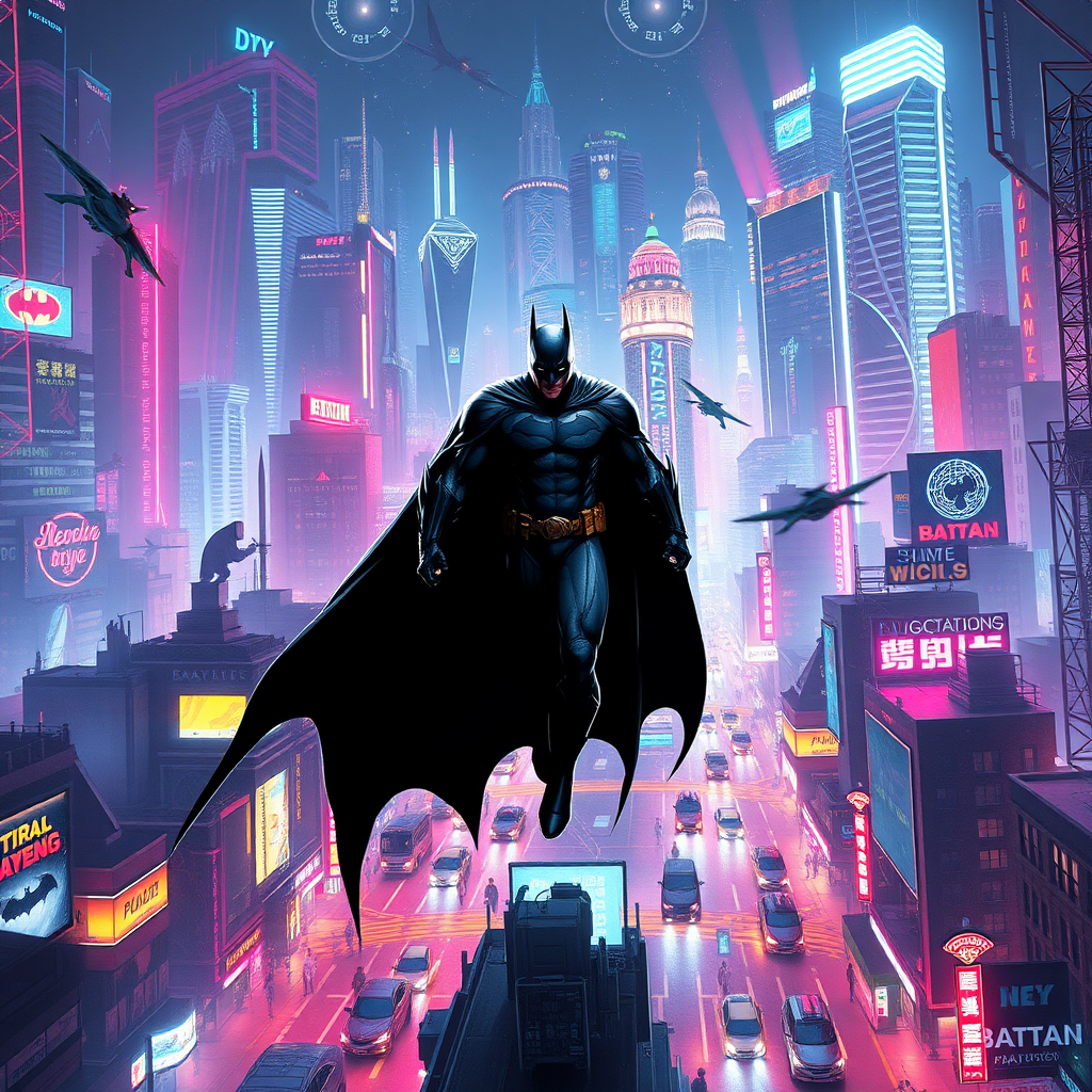 In the sprawling, neon-lit expanse of Night City, the shadowy figure of the Dark Knight prowls among cyber-enhanced skyscrapers. Amidst the cacophony of flying cars and bustling streets, Batman’s cape flows like liquid darkness, blending seamlessly into the pulsating urban landscape. His advanced tech and unwavering resolve make him a formidable presence in the city's underbelly, where mega-corporations and cyber-criminals conduct covert operations. Utilizing his unparalleled detective skills and gadgets, Batman works tirelessly to dismantle the web of corruption gripping the city, offering a beacon of hope to its downtrodden inhabitants. In this gritty cyberpunk realm, the legend of Batman takes on a new dimension, a guardian angel in a world teetering on the brink of chaos.