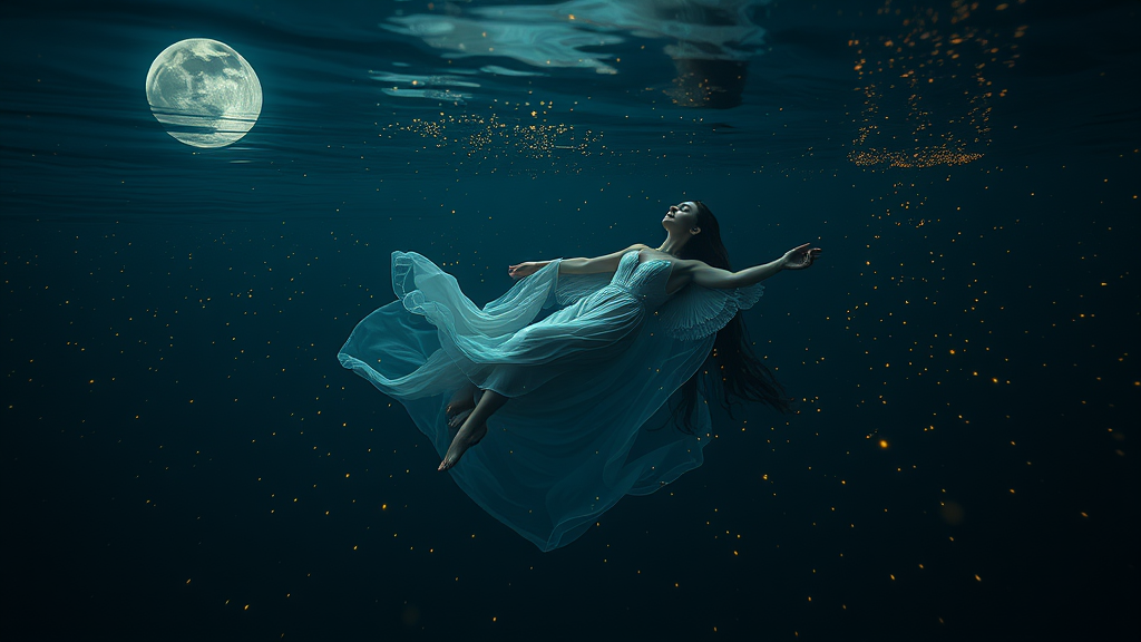 In the stillness of a moonlit underwater realm, a beautiful woman drifts gracefully, her form suspended in a tranquil, celestial pose. Clothed in a diaphanous, flowing silk gown that flutters like whispers around her, her legs cross elegantly while her arms stretch outward in an angelic embrace. Her serene face rests two feet below the water’s surface, as if in a peaceful slumber beneath a veil of liquid night. The ambiance is cool and otherworldly, with an icy stillness that lingers like a forgotten melody. Around her, a constellation of dozens of small, luminous orbs waltzes through the water, reminiscent of stars from a fantastical tale. These tiny orbs emit a soft, enchanting glow, casting a tender, golden light that bathes the scene in warmth and wonder. Scattered about, they sway and meander with the gentle currents, transforming the environment into a dreamscape. Their warm, ethereal light dances with the cold, dark water, painting dynamic reflections and intricate, lace-like patterns across her skin, the silk fabric, and the sandy floor beneath. The luminous orbs resemble a living constellation, bringing an elemental magic to this underwater universe. Volumetric beams of their glow radiate outward, creating a delicate, cinematic aura that flutters harmoniously with the water's gentle cadence. Tiny air bubbles escape from her gown, adding lifelike motion and vibrancy to the water’s serene stillness. Her hair, a stream of silken tendrils, floats freely, guided by the water’s subtle currents, enhancing the scene's weightless, ethereal quality. The starlit glow accentuates the fine textures of her skin, the silk fabric, and the water, crafting a timeless, cinematic tableau with the richness of a classic film reel.