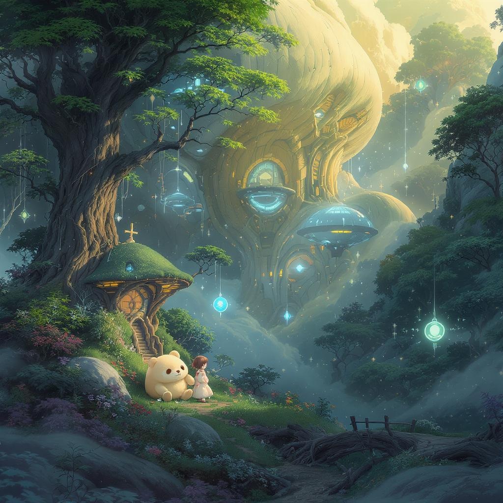 In the style of Digital 2D reminiscent of Miyazaki, the scenery unfolds into a futuristic, sci-fi, and magical dreamy landscape with ultimate detailed intricacy. A small cute girl lives alone with a plushified friendly giant tanuki amidst the overwhelming vastness of wilderness. The scene features intricate, round futuristic architectures with simple yet multilayered designs, nestled as habitation cabins among the trees. The atmosphere is imbued with dramatic soft lighting, encapsulating a cinematic feel while adhering to the rule of thirds. Slightly altered, the landscape now includes floating luminous orbs and ethereal mist, enhancing the enchanting aura of this idyllic universe.