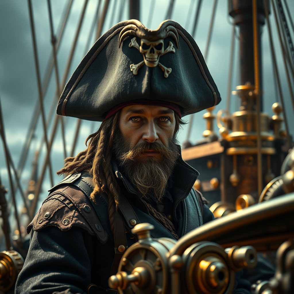 In the style of Sam Bosma, a space pirate with a single man wearing a Jolly Roger hat stands on a steampunk ship, surrounded by cinematic composition and dramatic lighting. The scene is highly detailed in 16k UHD HDR. The pirate’s eyes have unique features with a hint of mystery. The ship is an intricate masterpiece of brass and gears, emphasizing the steampunk theme. The atmosphere is adventurous, and the lighting casts deep shadows, adding a sense of drama and intrigue to the scene.