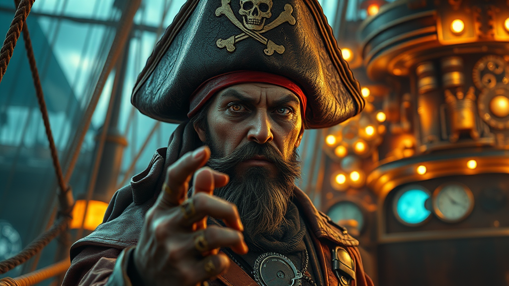In the style of Sam Bosma, envision a space pirate with a charismatic presence, donning a distinctive Jolly Roger hat. He stands aboard a magnificent steampunk ship, his surroundings illuminated by dramatic, cinematic lighting that highlights every high-detail aspect of the scene. The atmosphere is enhanced with 16k UHD HDR visuals, capturing the intricate textures and nuances of the ship's design. Despite his rugged charm, the pirate features distinct quirks—a hint of asymmetry in his eyes with a deformed iris and pupils that add a mysterious flair to his gaze. His unique characteristics extend to his hands, where extra fingers and subtly mutated forms mark his otherworldly nature. The scene is emphasized by intricate details, free of any digital imperfections or overlays, showcasing a compelling and imaginative universe inspired by his adventurous spirit.