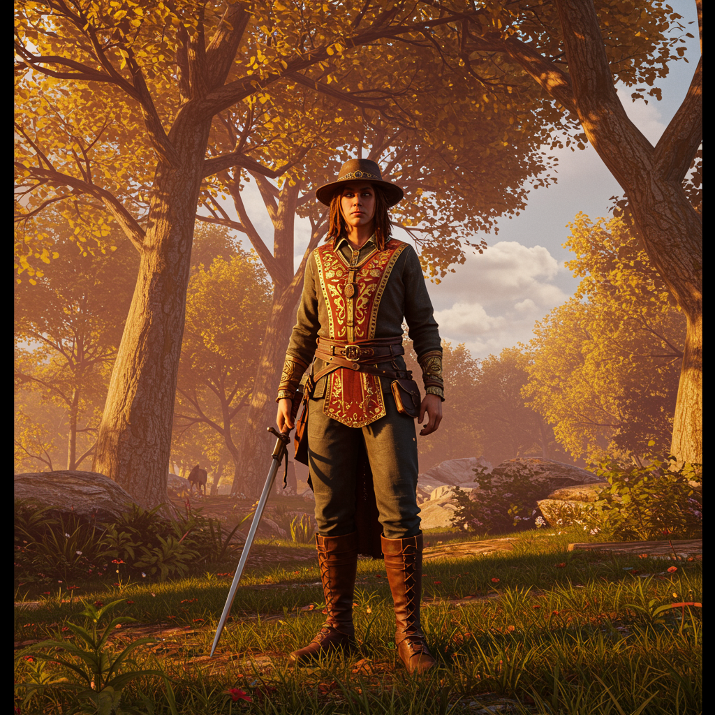 In the style of the post-'70s ego generation, capture a full-body portrait with the grandeur of an epic scale, infused with the adventurous spirit of rangercore. Imagine the vivid, timeless quality of a photo taken with Provia film, enhanced further by the visual power of UE5. Blend this with the elegance and opulence of royalcore, creating a scene that feels both majestic and adventurous. The composition should have a vertical orientation, with an aspect ratio of 85:128, presenting a harmonious balance between the natural world and regal aesthetics.