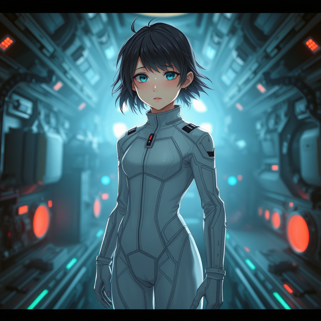 In the style of Tsutomu Nihei, envision a young girl clad in a white, form-fitting sci-fi jumpsuit, embodying the essence of cyberpunk. Her hair, styled with a slightly wild flair, floats in the cold atmosphere of a futuristic spaceship interior. Her expression is icy, set against a backdrop of a somber, dimly lit room. The setting is animated by sharp graphics, showcasing elements of anime and gigantism within a palette of muted colors, interspersed with striking blue and bright highlights from a singular angle. The environment is intricately detailed, featuring a multi-story space with sharp shadows and a blurred background that enhances the futuristic style. This hyper-detailed scene is accentuated by clusters of energy and sudden bursts of light in a third-person perspective. Round illumination and circular motifs are recurrent, occasionally incorporating elements of red. The depiction subtly hints at imperfection and distortion, with dual visages and torsos suggestively represented in a totem-like arrangement, embodying mutation and mutation. The composition conveys an unsettling beauty through blurred and exaggerated anatomy, invoking concepts of mutation and transformation. The setting captures a lifeless ambiance, punctuated by natural light filtering through round windows, creating an ethereal, otherworldly atmosphere.