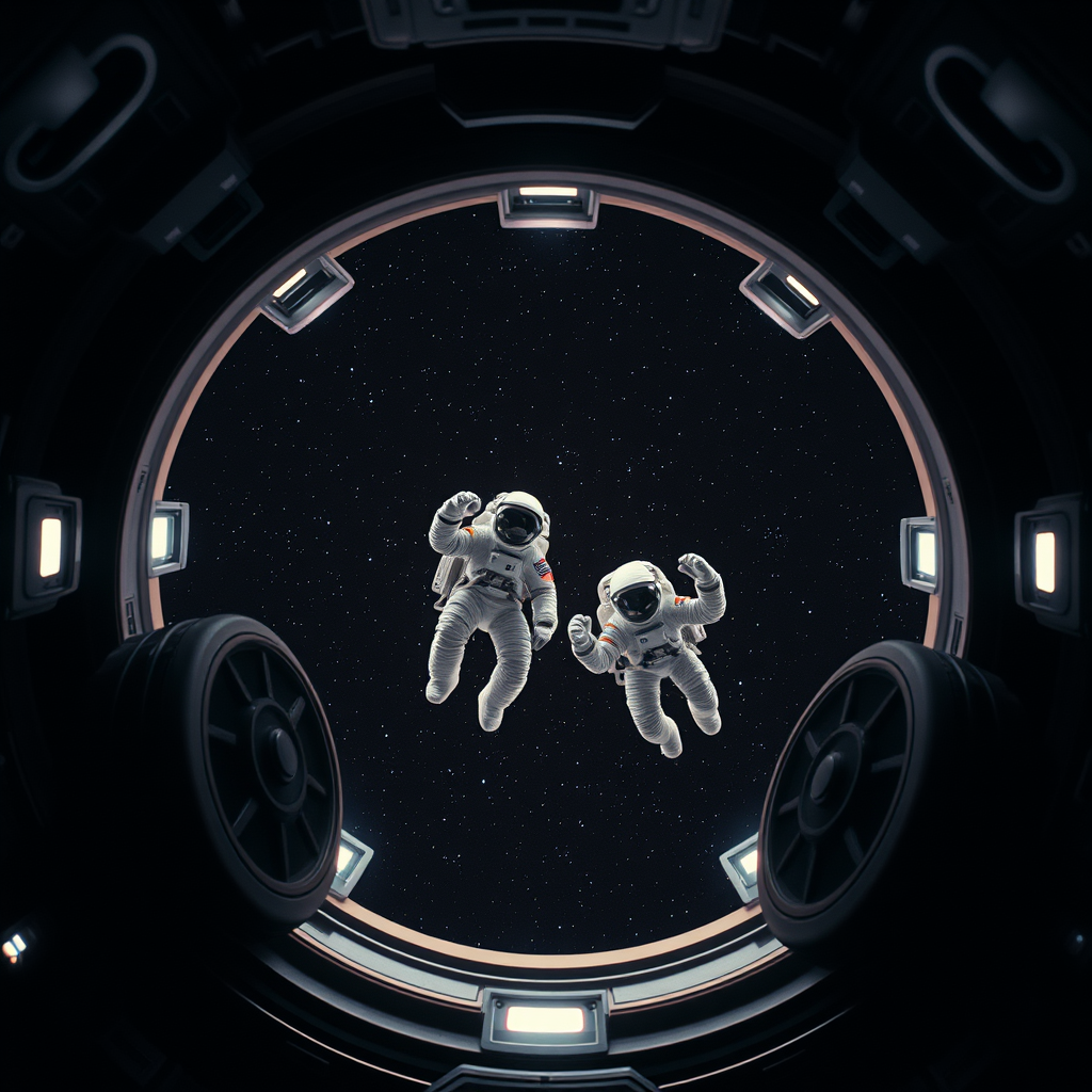 In the style reminiscent of a classic 80s sci-fi film, imagine a scene from above, capturing two astronauts gently floating in a zero-gravity environment. The scene is framed by an open circular hatch, accented by large black wheels and soft ambient lights. The vast, dark expanse of space serves as a backdrop, speckled with the twinkling of distant stars. The overall composition is minimalist yet futuristic, echoing the visionary works of artist John Berkey.