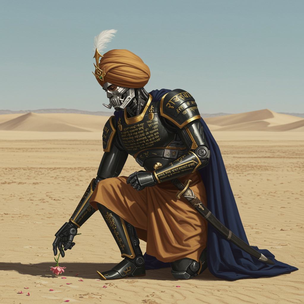 In the vast expanse of the barren desert, an 1800s Sikh king kneels gracefully, adorned in a majestic turban and enveloped in a Japanese mecha exoskeleton inspired by gundam and warhammer aesthetics. The exoskeleton, crafted from gleaming carbon fiber, is intricately engraved with gold Punjabi script, bestowing the suit with mystical energies. His face, concealed by a detailed metal mask, exudes an aura of mystery and power. A cascading, heavy cape flows behind him as he reaches out delicately to pick a solitary flower, juxtaposing the harsh, endless desert with a touch of poignant beauty. This neo-futuristic armor, combining elements of modern history, reflects influences from Akira and Star Wars, with a nod to Akira Kurosawa's storytelling. The scene is bathed in natural daylight, highlighting the painstakingly detailed art style reminiscent of masters like Norman Rockwell, Syd Mead, Boris Vallejo, and Moebius. It carries echoes of historical grandeur with a Rembrandt-inspired romanticism, and the blink-and-you-miss details capture the essence of a peaceful, timeless moment in a desolate landscape.