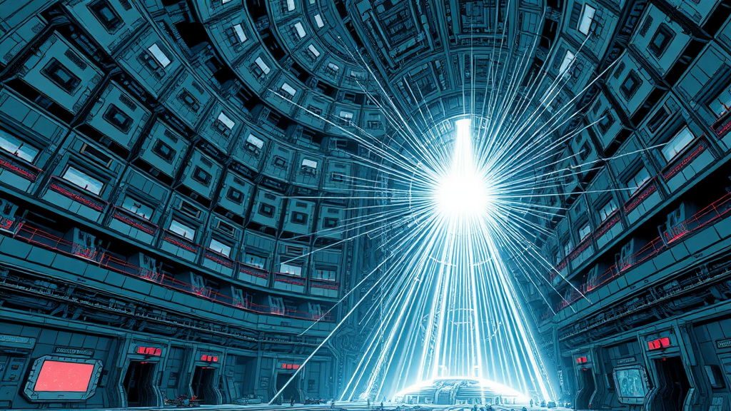 In the vast interior of a spaceship, drawn in the Tsutomu Nihei style reminiscent of Sidonia no Kishi, the atmosphere is dominated by a sense of gigantism. A colossal laser generator stands as the centerpiece, spanning multiple stories in a space designed with a futuristic aesthetic. The scene captures the essence of Sci-fi with hyper-detailed elements. From above, a laser descends, casting intense beams downwards, converging in a symphony of energy clots that spiral around it. The air is charged with acceleration, light flashes at blistering speeds, encapsulating an anime-like dynamism. This artwork brings life to a manga-inspired universe, rendered in 8K, HD, with super-resolution clarity, where every structure and shadow stands out in crisp manga graphics.