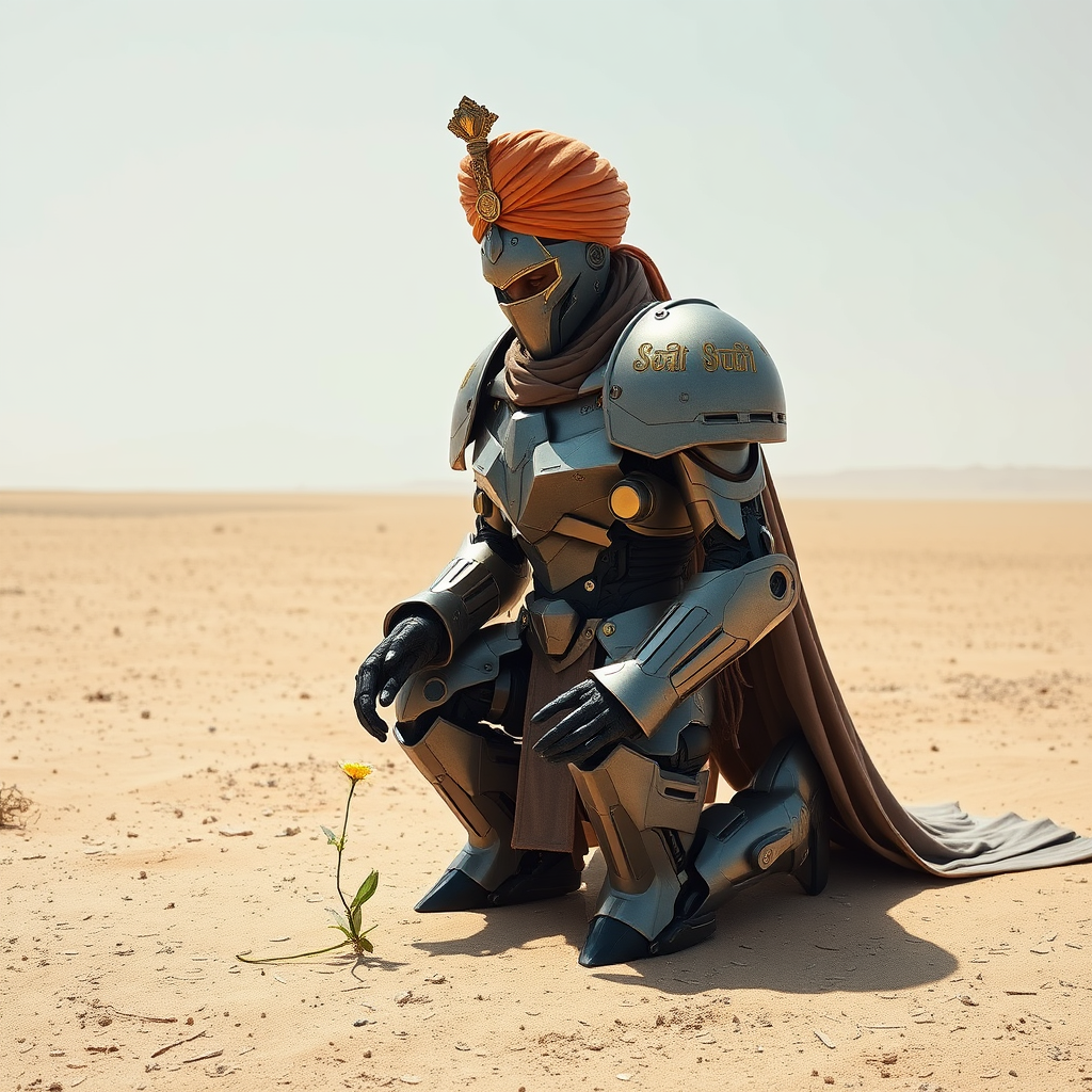 In the vast, serene expanse of a barren desert, a formidable figure kneels—a Sikh king from the 1800s, adorned in a magnificent turban and encased in a Japanese-inspired mecha exoskeleton. This Gundam suit, reminiscent of a warhammer, is a fusion of neo-futuristic technology and historical grandeur, engraved with intricate gold Punjabi letters that bestow magical powers. The king's face is concealed by a metal cover, exuding an enigmatic aura, as he delicately picks up a solitary flower amidst the desolation. The carbon fiber armor gleams under the natural daylight, an elegant blend of function and art, with a long, heavy cape flowing behind. The scene is tranquil yet charged with potential, a romantic intersection of modern history and futuristic technological marvels. The endless desert stretches into infinity, calm and peaceful, framed by the meticulous artistry reminiscent of Akira and Star Wars. Each painstakingly crafted detail is like a hidden gem, fleeting and precious—echoing the masterful styles of Akira Kurosawa, Norman Rockwell, Syd Mead, Boris Vallejo, Jean Giraud Mobius, John Berkey, Eugène Delacroix, and Rembrandt Van Rijn, weaving together a vision of timeless beauty and innovation.