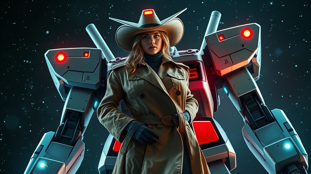 In the vastness of space, a scene of wonder unfolds as a daring Space Cowgirl commands the cockpit of a colossal Gundam. This towering humanoid robot boasts sleek, reflective armor adorned with glowing neon accents that pulse with energy. The Space Cowgirl, an icon of fearless exploration, merges classic and futuristic styles with ease. Her rugged, weathered trench coat flutters weightlessly in the void, adding a dynamic flair to her presence. A well-worn, wide-brimmed cowboy hat, slightly tilted, casts a mysterious shadow over her sharp, determined eyes. Her gaze pierces through the stars, reflecting a spirit of adventure and resilience.