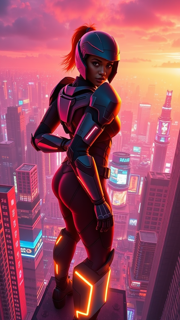 In the vibrant, neon-drenched cityscape of Neo-Tokyo, a black woman with striking ginger hair poses dynamically atop a towering skyscraper. Her sleek, angular armor glows with pulsating neon lights along its edges, creating a stark silhouette against the futuristic skyline. Around her, flying cars zip past the sprawling expanse of skyscrapers, each adorned with bright, holographic advertisements. As the camera draws closer, her helmet projects a holographic display that bathes her face in a soft, futuristic glow. Her deep-set eyes, focused and determined, scan the city below using advanced sensors. The scene is an artistic fusion of cyberpunk aesthetics reminiscent of Blade Runner, the high-tech action energy of Starship Troopers and Dredd, and enriched by the imaginative world-building flair of Pixar's Buzz Lightyear. This cinematic marvel, directed by the renowned Ridley Scott and the visionary Ava DuVernay, promises a thrilling visual adventure. It centers around a powerful, empowered black female protagonist, depicted with photorealistic, hyperrealistic details, highlighted by soft lighting and intricate textures. The atmosphere is a cinematic masterpiece, capturing the essence of hyper-realism and meticulous detail, wrapped in an analog film-like style that brings the scene to life in stunning 8k resolution.